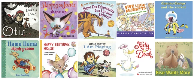 Titles Include:Katy Duck Five Little Monkeys Jumping on the Bed Llama Llama Zippity-Zoom Happy Birthday, Mouse! Otis Little Critter: I Am Playing Curious George and the Rocket Skippyjon Jones Shape Up Bear Wants More How Do Dinosaurs Go Up and Down?