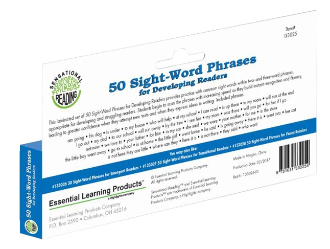 Uses known words to construct longer phrases found in conventional reading. This set of 50 phrases provides practice with common sight words within two- and three-word phrases, appropriate for developing and struggling readers. Students begin to scan phrases with increasing speed as they build instant recognition and fluency. 50 each. 2 x 8 inch laminated cards.
