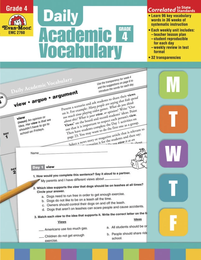 Evan-Moor Daily Academic Vocabulary Book perfect for fourth graders provides 36 weeks of systematic instruction to learn 97 key academic vocabulary words that they are likely to come across in multiple subject areas and in assessment instruments. Examples of the words presented in the book are adapt, dependent, outline, alter, detect, prompt, compose, identify, reveal, consult, indicate, sequential and more.