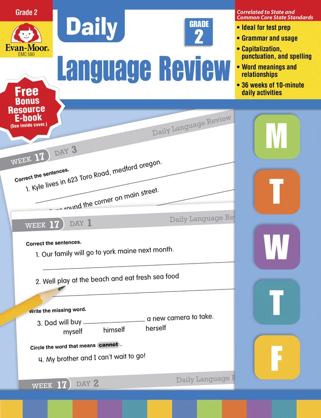 Evan-Moor Daily Language Review Workbook for grade 2 renders five items for every day of a 35-week school year that is presented in a standardized-testing format. Book of 112 pages help to keep your students very sharp in punctuation, sentence editing, vocabulary, reference, grammar and word study skills. Includes scope-and-sequence charts, suggestions and answer keys for the teacher.