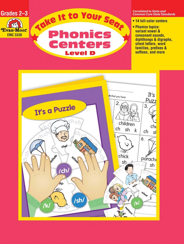 Take It to Your Seat Phonics Centers, Level D is an instructional must-have in 2-3 classrooms. The 14 full-color centers stored in envelopes provide engaging, independent practice of the phonics skills presented. Includes topics like vowel digraphs, rhyming words, plurals, and inflectional endings. This resource contains teacher support pages, reproducible student pages, and an answer key. 192 pages.