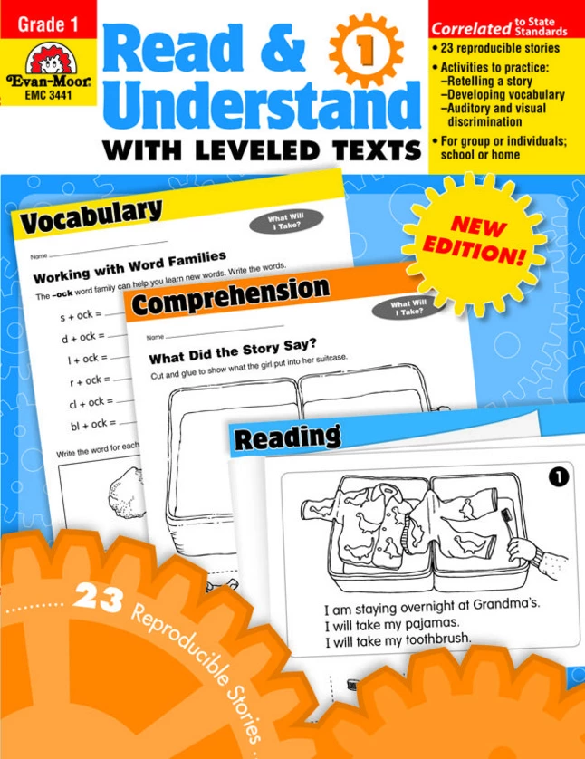 Evan-Moor Read and Understand with Leveled Text Stories and Activities Book for grade 1 help your students develop comprehension and vocabulary skills. Leveled reading selections, follow-up comprehension and vocabulary activities cover skills and concepts like synonyms as well as recalling information. Text containing 25 engaging reading selections can easily match texts to students abilities. 160 pages.