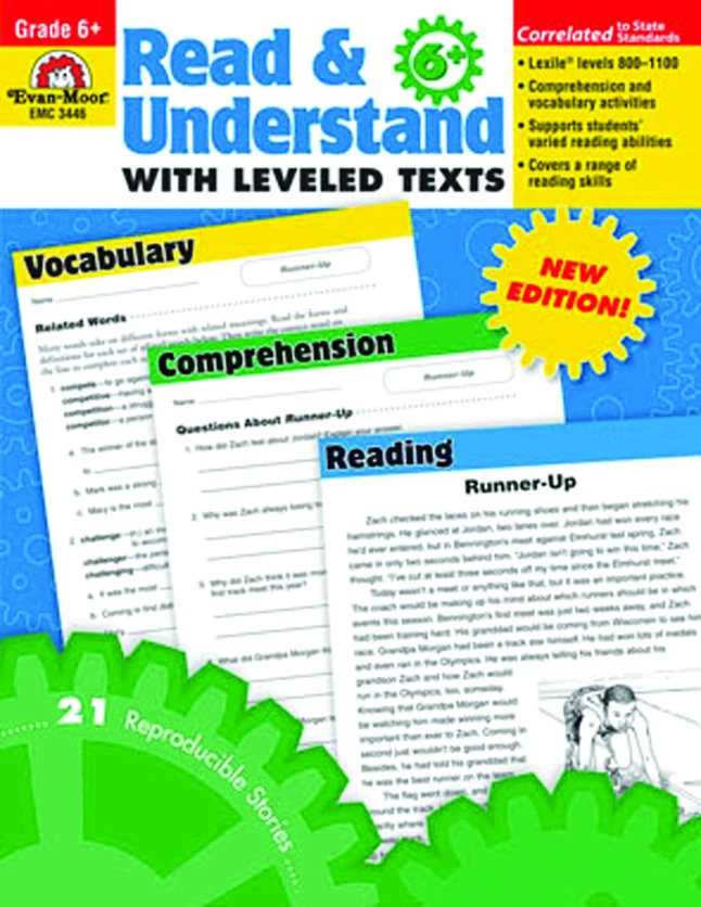 Evan-Moor Read and Understand with Leveled Text Stories and Activities Book for grade 6+ help your students develop comprehension and vocabulary skills. Leveled reading selections, follow-up comprehension and vocabulary activities cover skills and concepts like synonyms as well as recalling information. Text containing 25 engaging reading selections can easily match texts to students abilities. 160 pages.