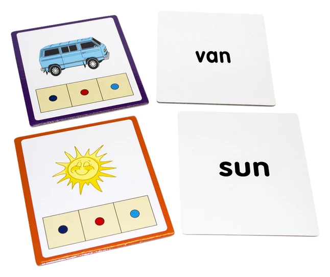 - An image and phoneme color coding is presented on one side, along with the whole word presented on the back
