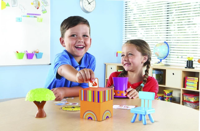 - Two to four players will use a spinner to show them where to place picture cards near plastic manipulative objects (like in a tree, on a hat, over a chair, in a box, and more!)