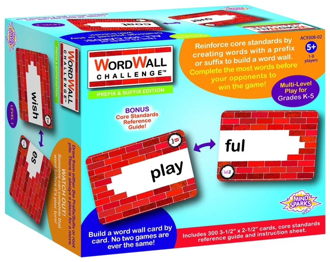 Reinforce core standards in ELA-Literacy with Mind Sparks WordWall Challenge card games! Create words to build a word wall, card by card. There is always a place for a move, but watch out…someone may finish that word before your next turn! Complete the most words before your opponent(s) to win the game! This versatile, multi-level card game is rated for Grades K to 5 can be played as a single player or with up to eight friends – perfect for home or classroom use! And no two games are ever the same! Double-sided, color-coded cards measure 3-1/2 x 2-1/2 inches each and feature four different skill levels. Ideal for ages 5 and up.