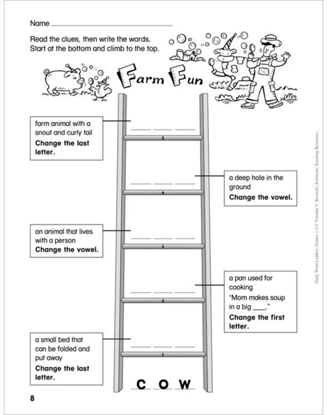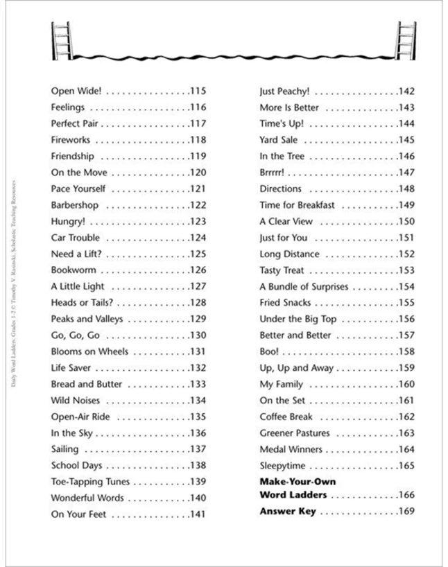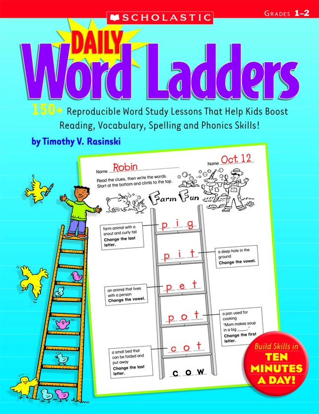 Students climb to new heights in reading and writing with these fun, engaging, reproducible word-building games! Students read clues on each rung, then change and rearrange letters to create words until they reach the top. All the while, they’re analyzing sound-symbol relationships, broadening their vocabulary, and building spelling skills to become better readers. 176 pages. Grades 1-2.