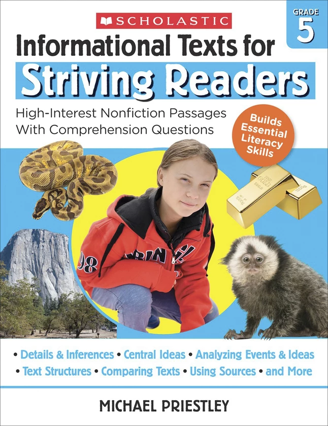 Expand students’ reading-comprehension skills with this collection of 35 high-interest informational texts that are sure to keep them engrossed. The easy-to-read passages are organized in ten chapters that focus on specific reading standards and skills, including analyzing events and ideas, word meaning, purpose and point of view, using sources, and more. Comprehension questions follow each passage. There’s also a summative practice test as well as an answer key with rationales. Appropriate for ages 10 to 11.