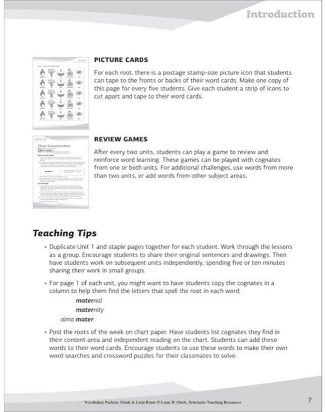 Eight ready-to-go activity packets sharpen students’ word-study skills and boost their vocabularies. In each packet, students learn five common Greek and Latin roots and 15 new words formed from these roots. Crossword puzzles, word searches, and other fun activities provide repeated practice to make new vocabulary stick. Also includes mini-picture cards! Perfect for independent work or for homework. Grades 4 to 8.