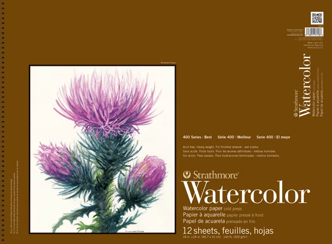 Strathmore 400 Series Watercolor Pad features intermediate grade watercolor paper that is famous with watercolorists of all levels because of the fine and even washes that can be achieved using this sheet. It has natural white color paper with traditional cold press surface making it perfect for mastering watercolor techniques. Book with two deckled edge sheet stock has a strong surface that allows for lifting and scraping applications. Book measuring 18 x 24 inches contains 12 sheets of 140 lb basis weight paper.