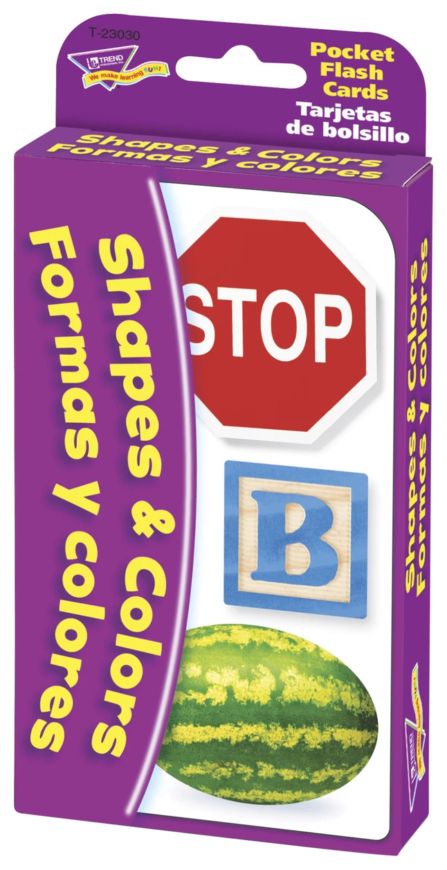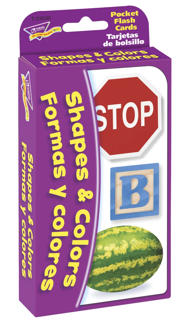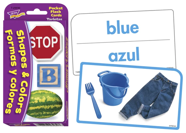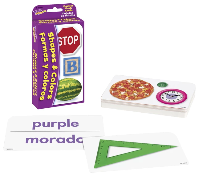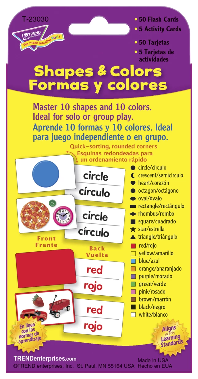 - Photographed image on front of each flashcard provides easy, real-life clue for English and Spanish words for 10 colors and 10 shapes